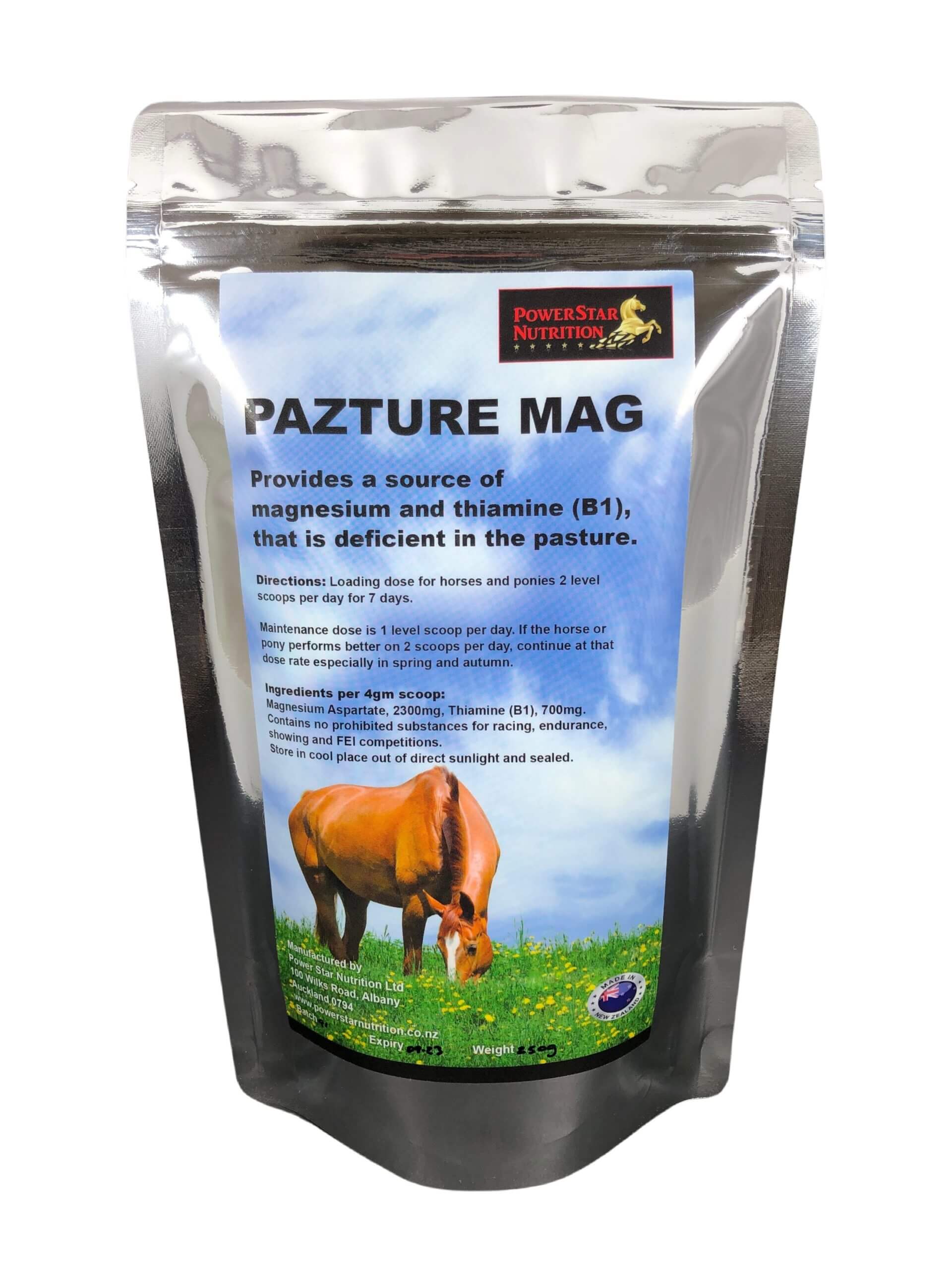 Pazture Mag is a daily nutritional supplement that provides a highly absorbable form of magnesium and thiamine (B1). Pazture Mag is perfect for feeding in times of grass growth or when it rains after a dry spell.